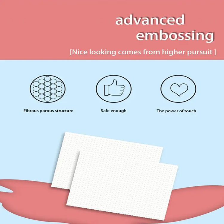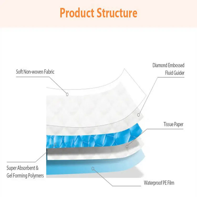 2) శోషక పొర టిష్యూ పేపర్ మరియు అధిక పాలీమర్ శోషక రెసిన్తో పూసిన మెత్తని గుజ్జుతో కూడి ఉంటుంది. అధిక పాలిమర్ శోషణ